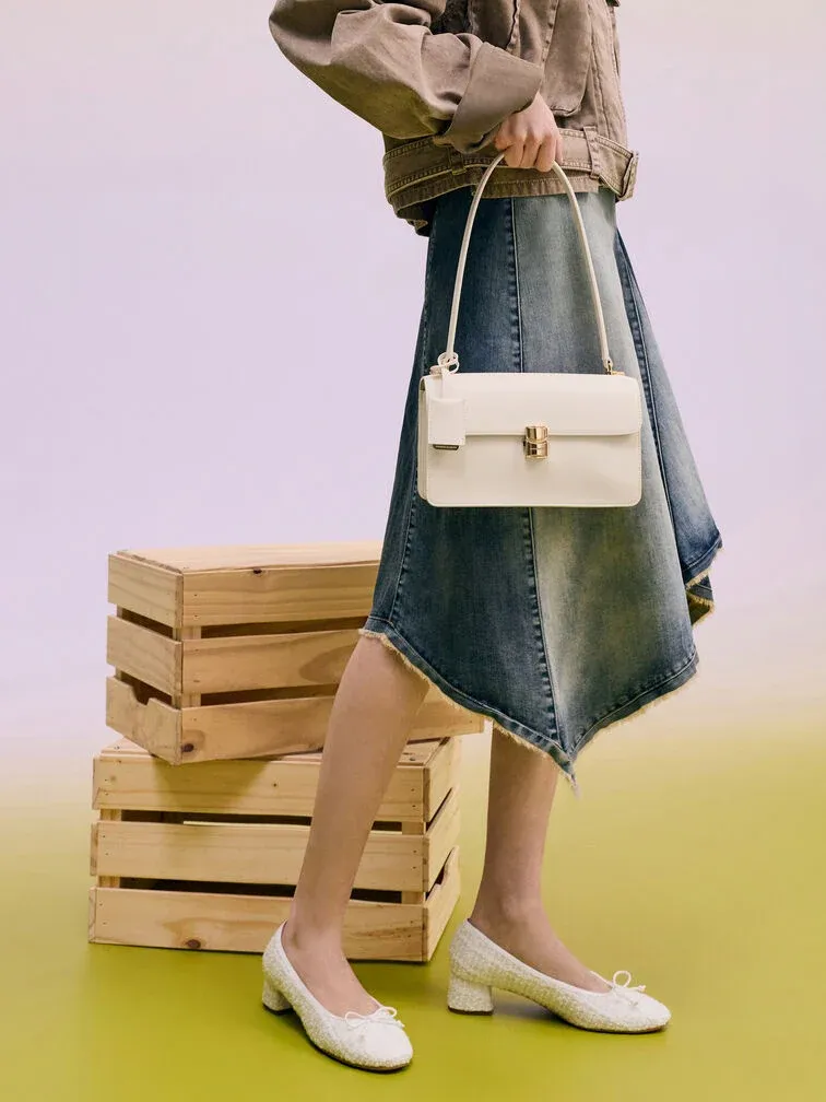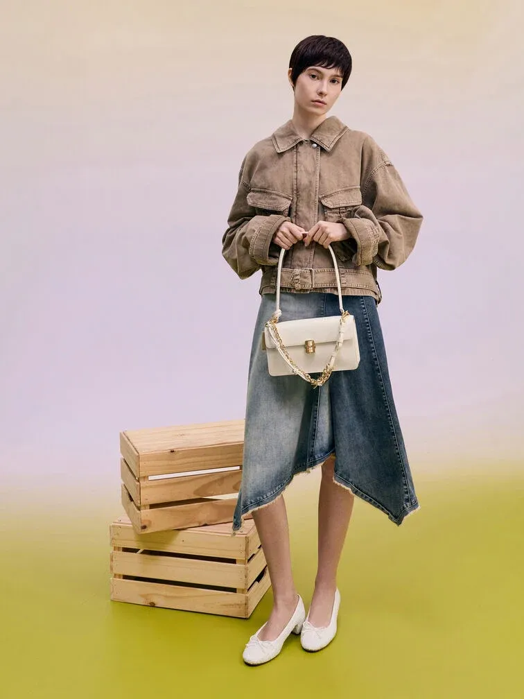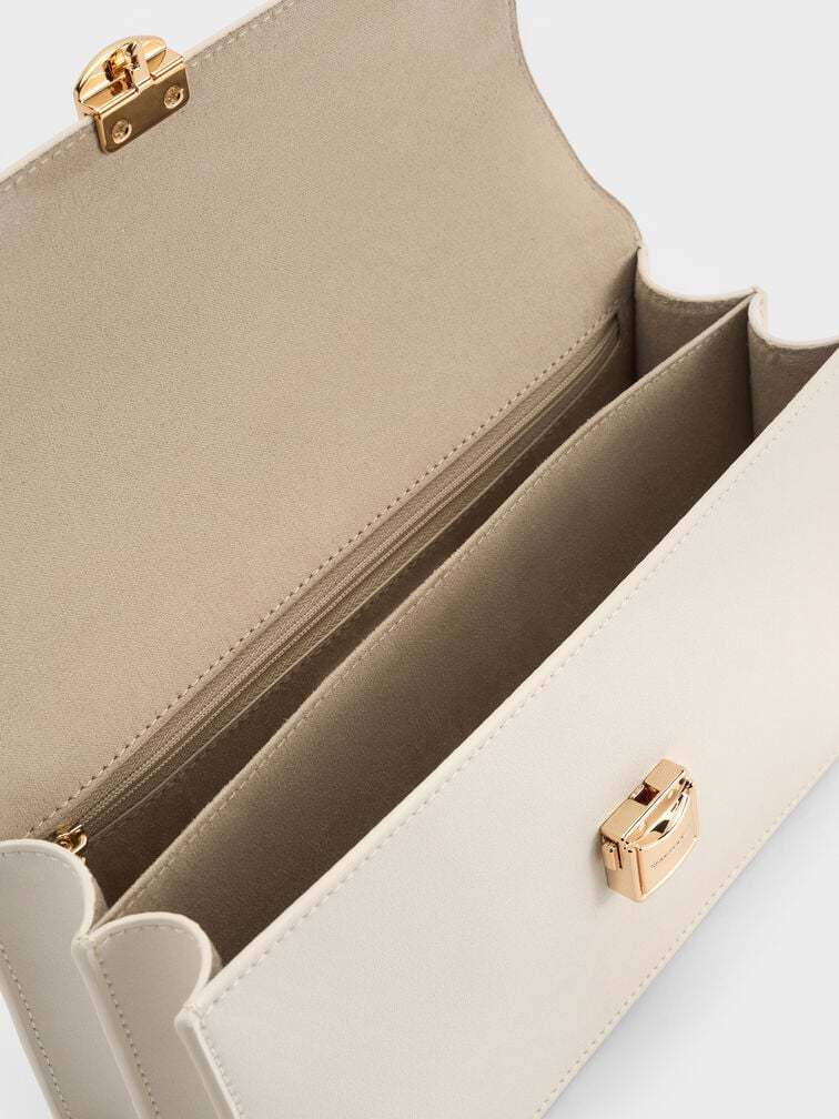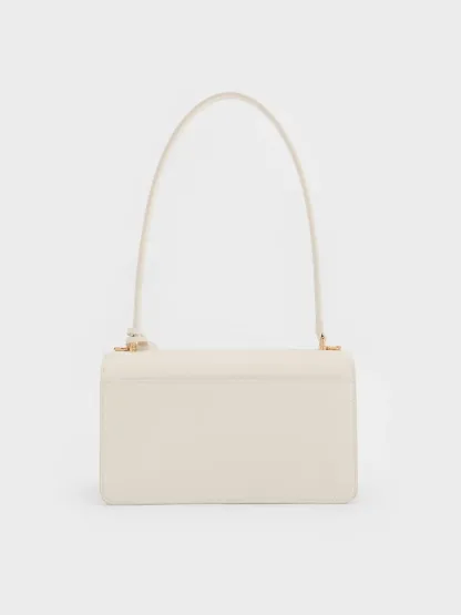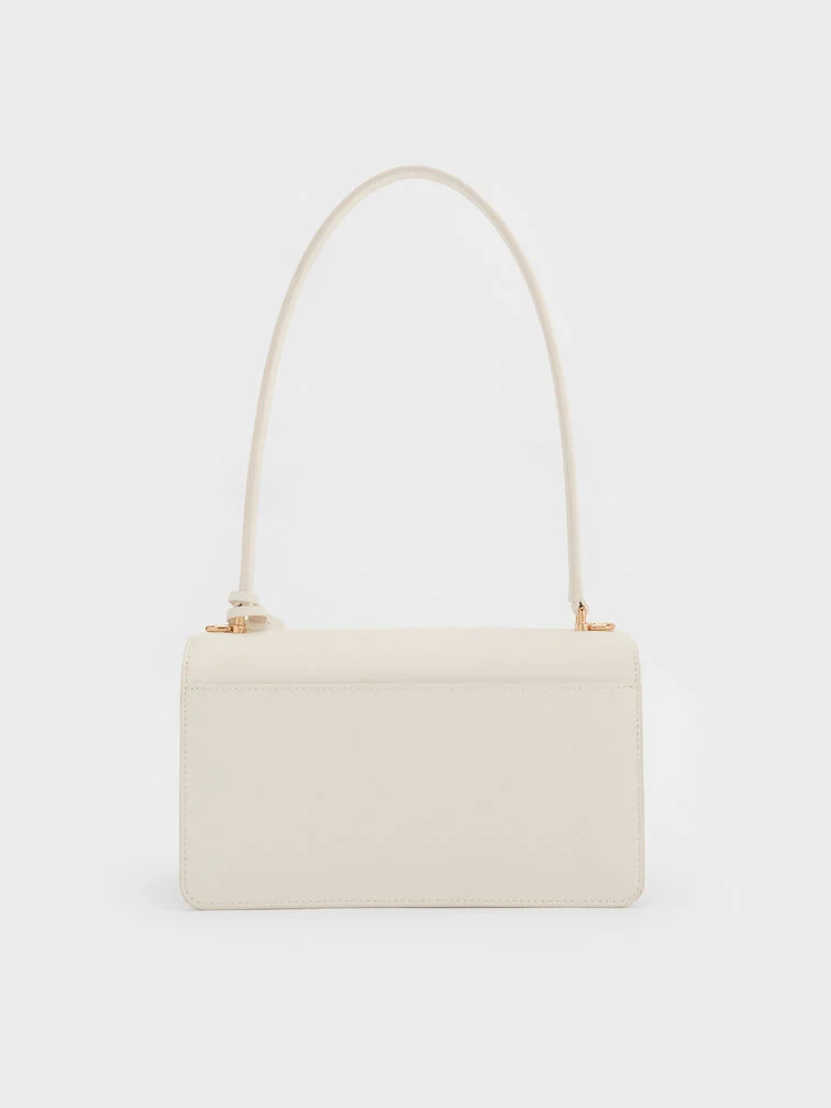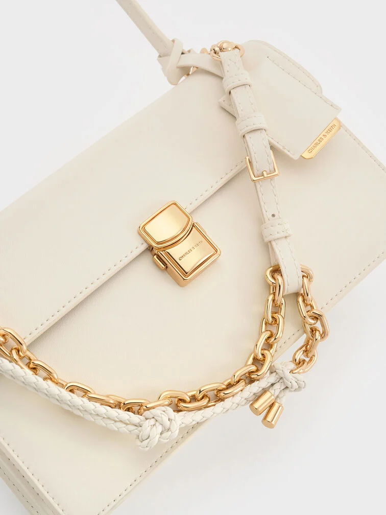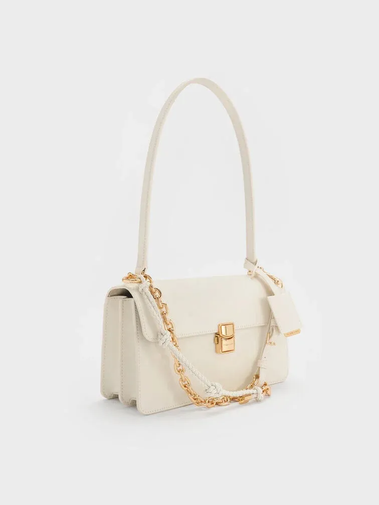This Acelynn shoulder bag in cream features a rope-chain strap, a distinctive metallic buckle, an elongated handle and a front-flap design with a push-lock closure. Carry it to exude quiet confidence in the office and other professional settings.