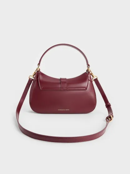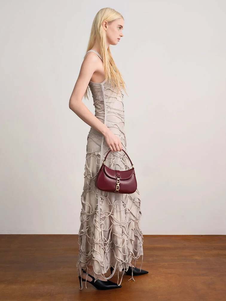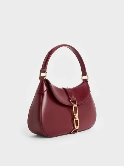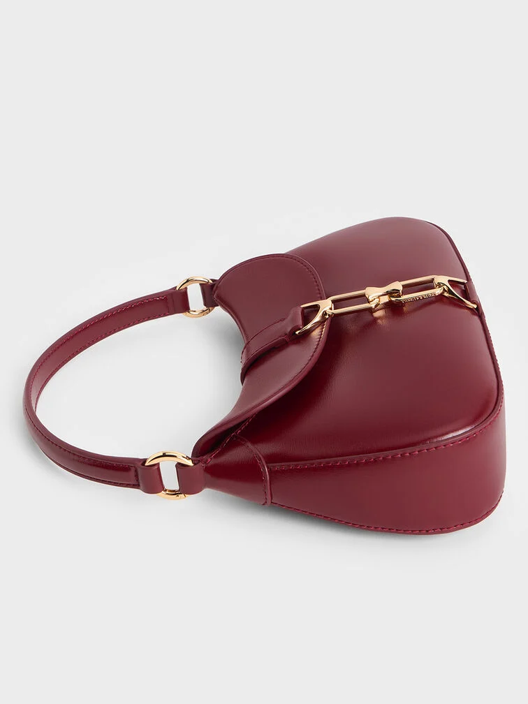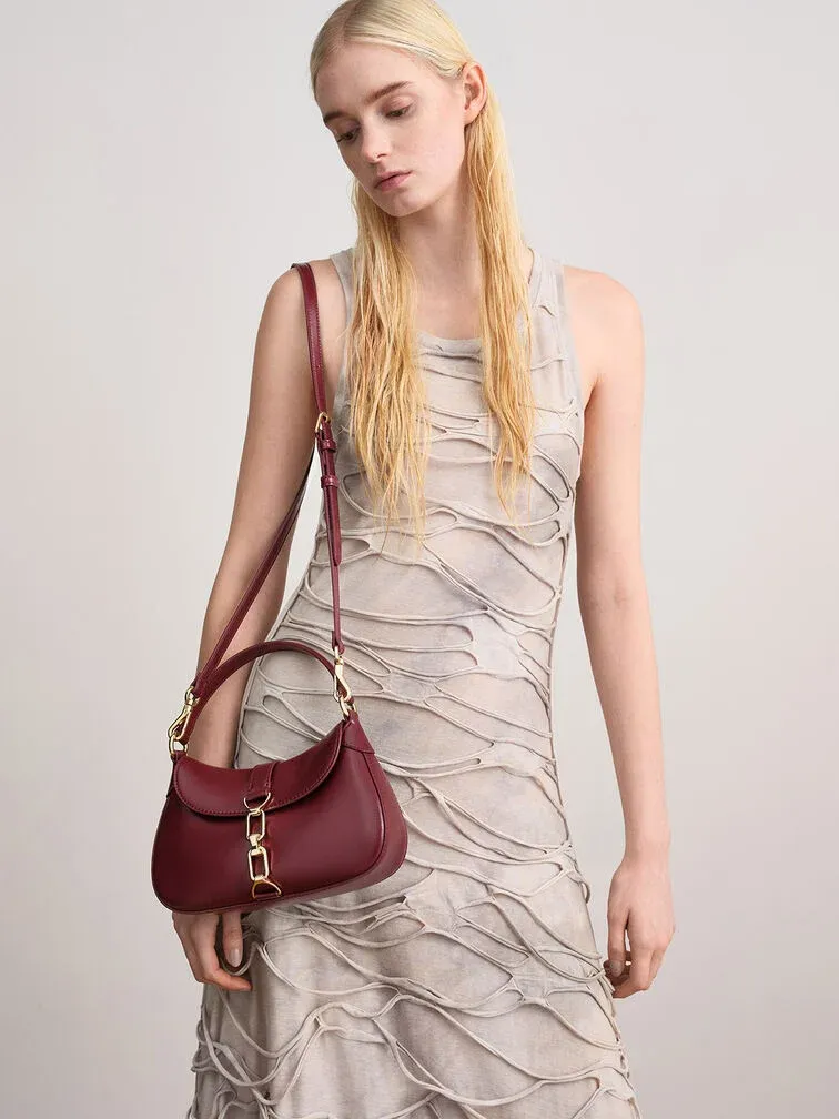 If you are looking for a mini bag that is more sophisticated than cute, this Agatha hobo bag may be it. Featuring a distinctive gold-tone chain accent down its front and a curved handle, it is a fabulous companion when you want to travel light. In rich burgundy, it is certainly a statement piece, yet it is still versatile enough to be dressed up or down. To keep your hands free, simply clip on the detachable strap to turn it into a nifty crossbody bag.