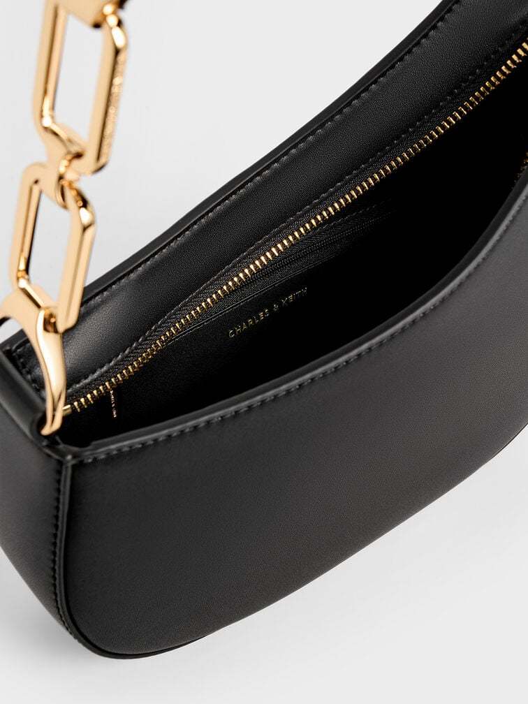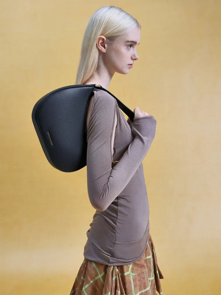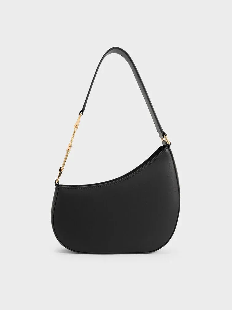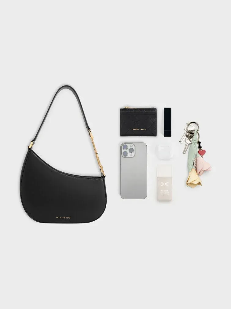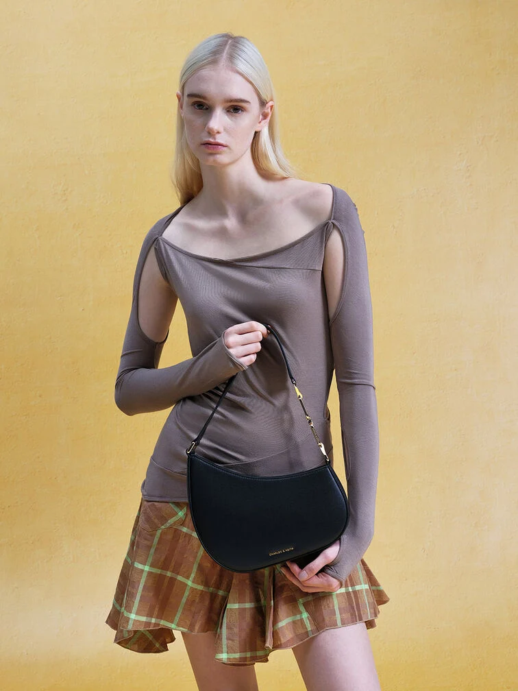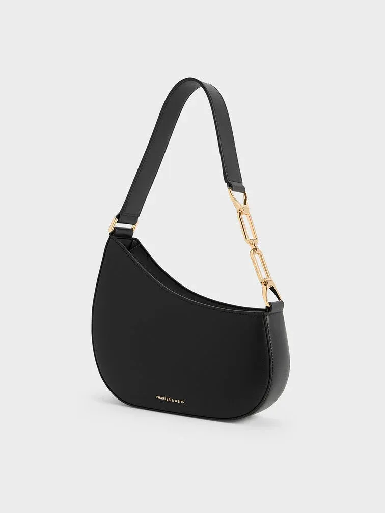This Agatha shoulder bag in black is set to be a favourite piece in your wardrobe. It has an asymmetrical half-moon design that makes it stand out. Promising maximum styling versatility, you can count on this bag to match well with everything in your wardrobe while looking effortlessly chic. The geometric chain accents on the strap also add subtle shine and visual interest.