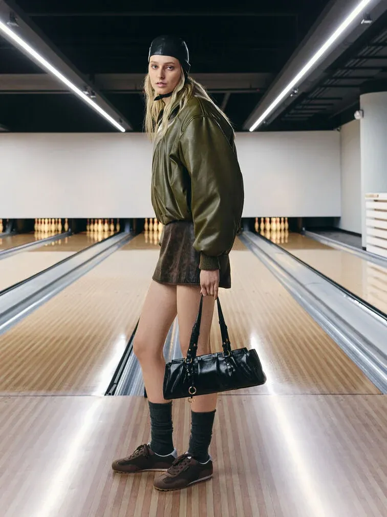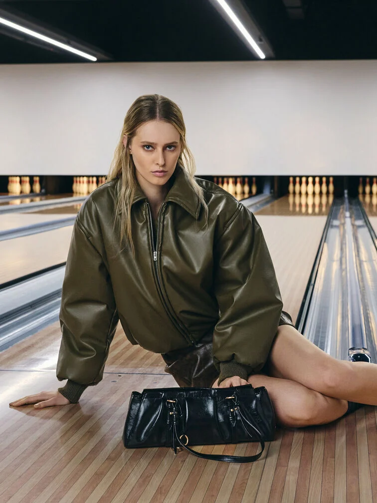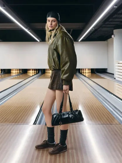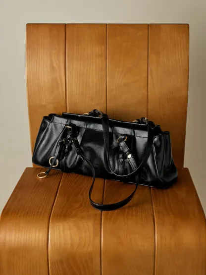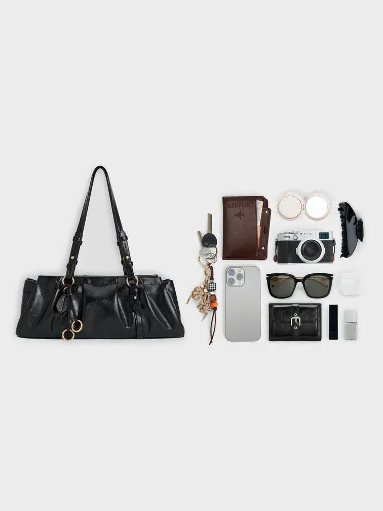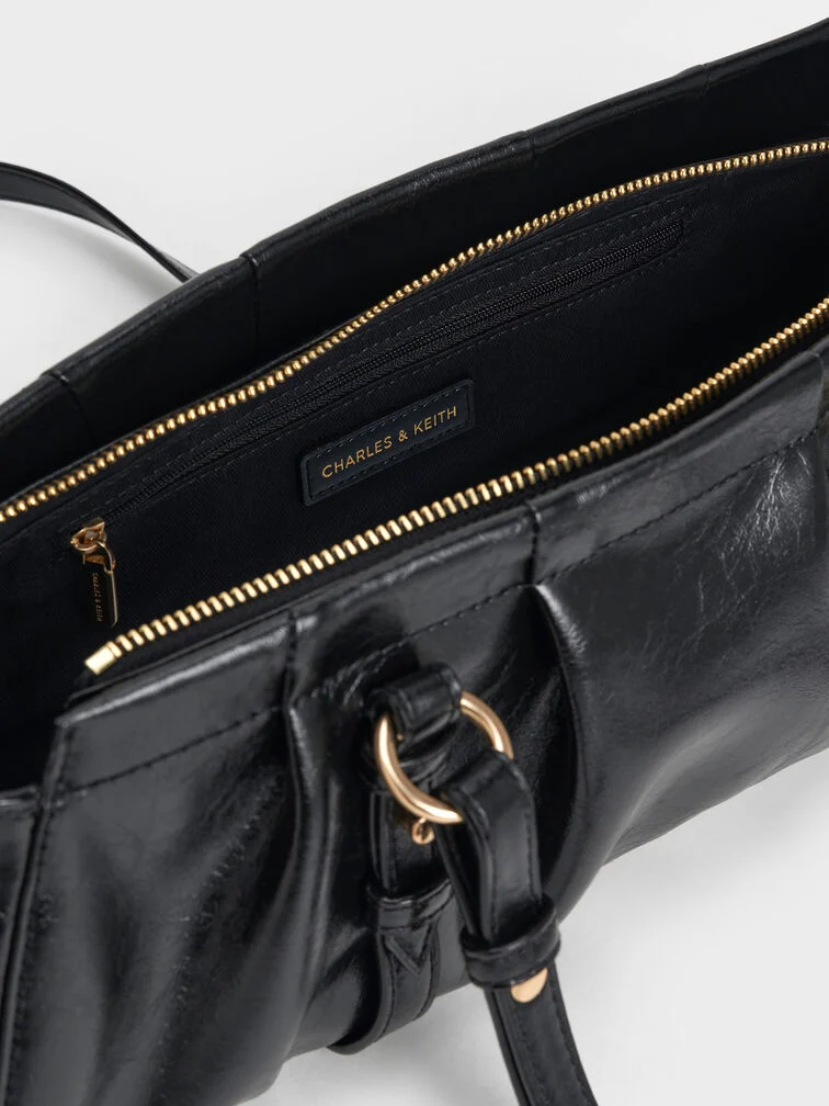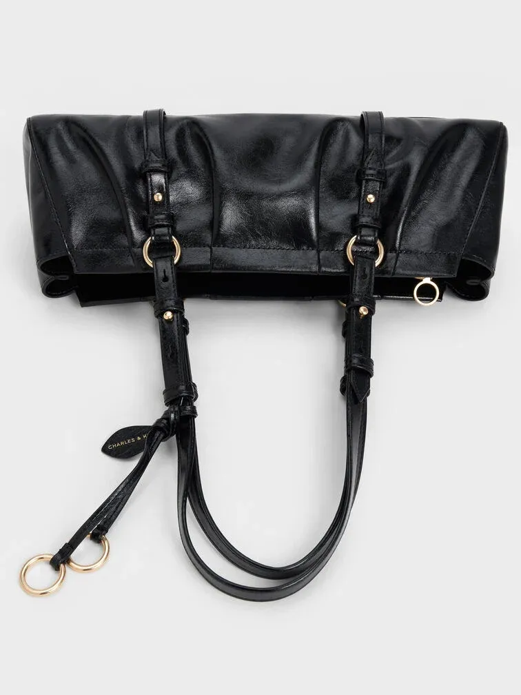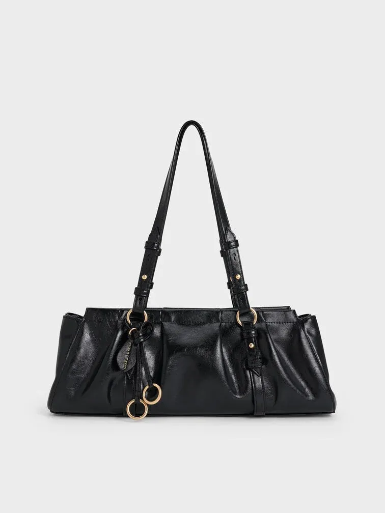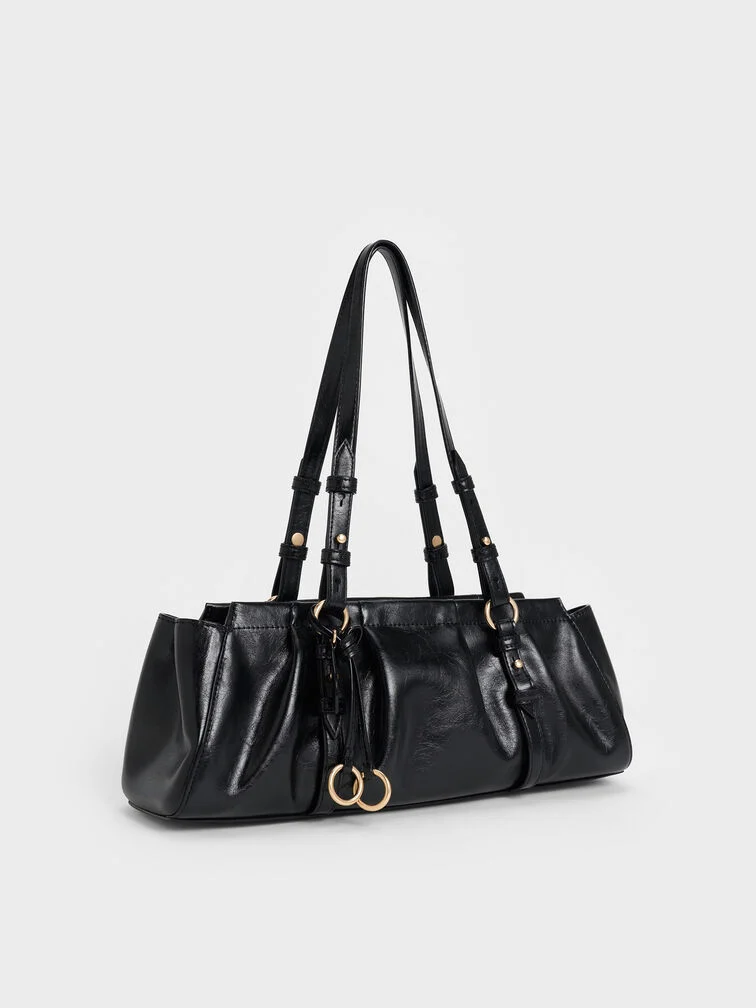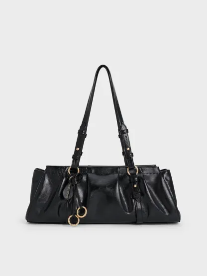 This Britton shoulder bag in black features an east-west silhouette, elongated shoulder straps, a ruched finish and a detachable keychain. Let it add subtle visual interest and a polished element to your workwear edits.