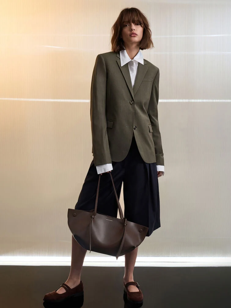 This Calla tote bag in espresso brown features a striking geometric silhouette and elegant elongated straps. Carry it with with understated jumpsuits to form an ensemble that�s subtly structured, working beautifully from desk hours to relaxed night outings.