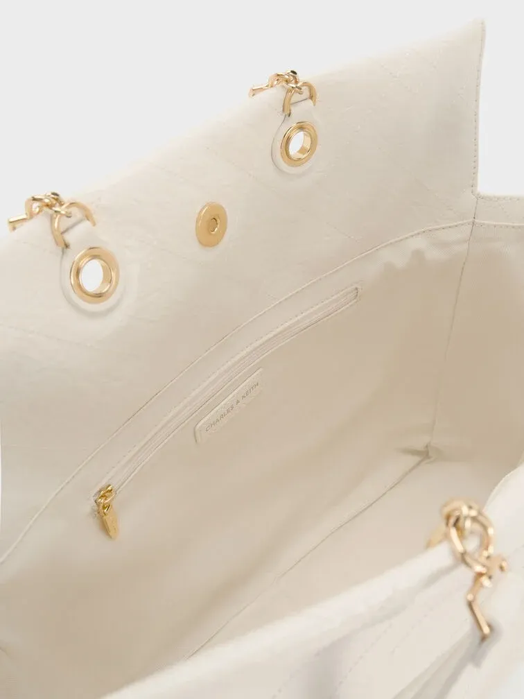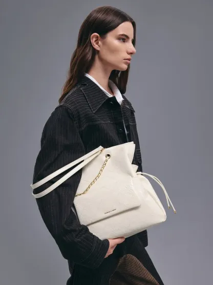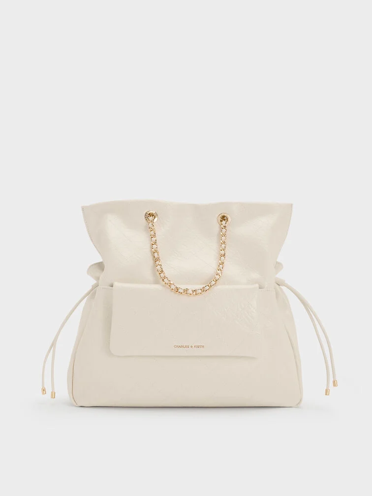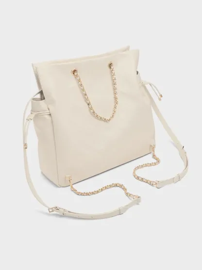 This Duo backpack in cream features a slouchy silhouette, a quilted finish, braided straps and drawstring details. It can be carried as a backpack via the adjustable shoulder straps or on the crook of your arm by the braided straps.
