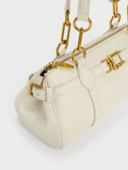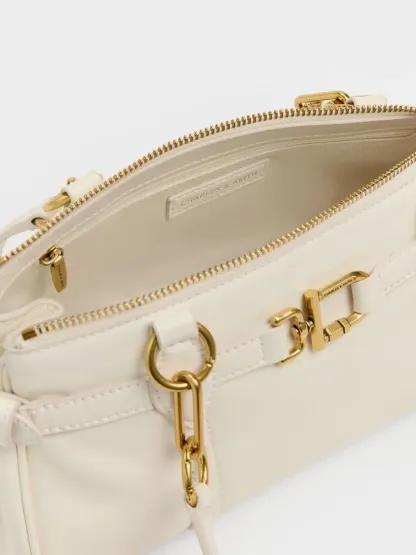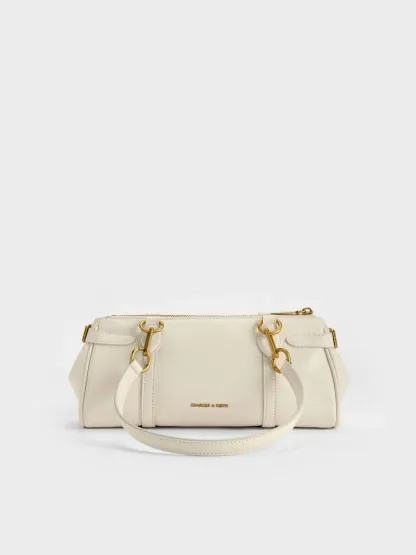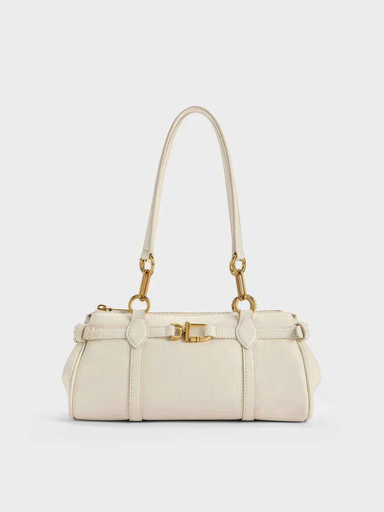 This Gwynne elongated shoulder bag in cream features a sleek east-west silhouette, stitch-trim strap details, gold-tone metallic accents, adjustable side buckles, a top-zip closure and double handles. Carry it with tailored workwear or casual outfits to complete your look with eye-catching shine.