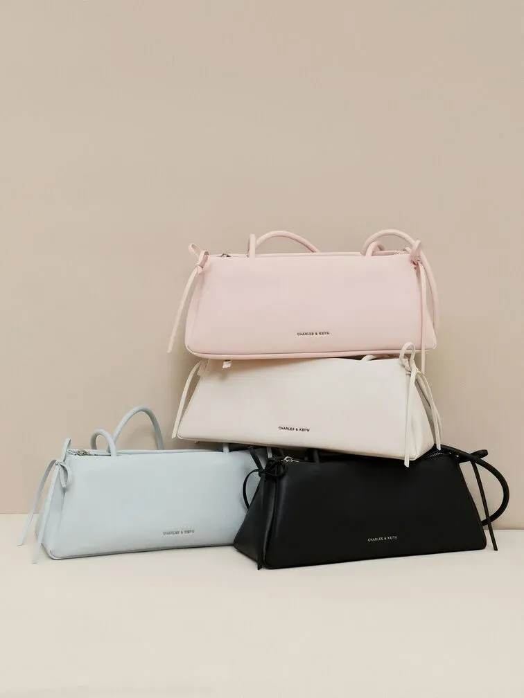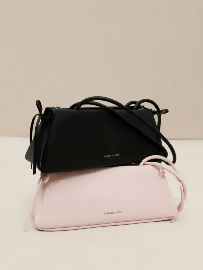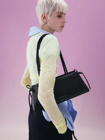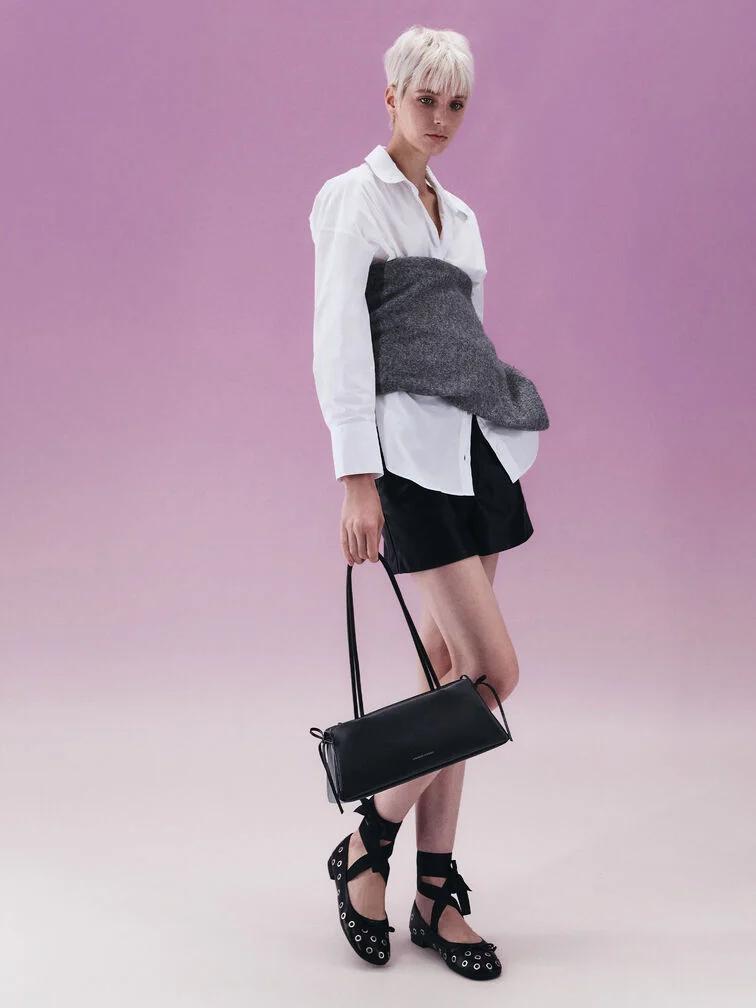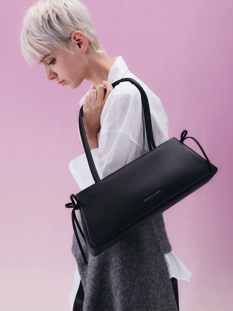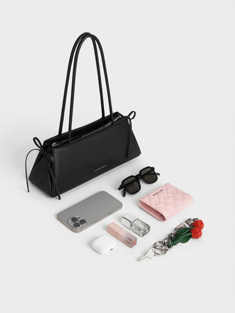 East-west bags continue to trend, and this shoulder bag in noir may be your new go-to carrier. Clip on your favourite bag charms to add visual interest to the minimalist design. Little bows adorn the sides of this shoulder bag for the perfect finishing touch.