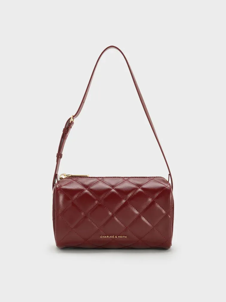 This Janie shoulder bag in burgundy features a quilted finish, a rectangular silhouette, a single adjustable strap and a zip closure. Carry it to introduce soft structure and rich colour to your both your workplace and off-duty looks.
