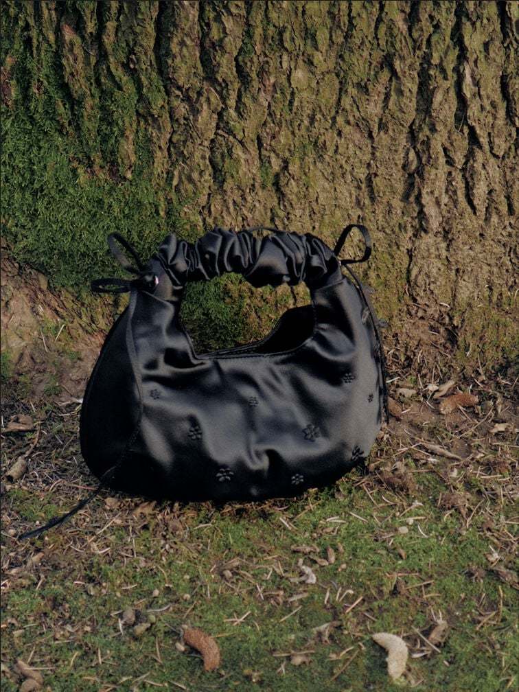 This Mabel hobo bag in black is made with satin. It features flower and vine embellishments, a ruched handle, and a magnetic closure. Clip on the accompanying shoulder strap and use it as a crossbody bag to keep your hands free.