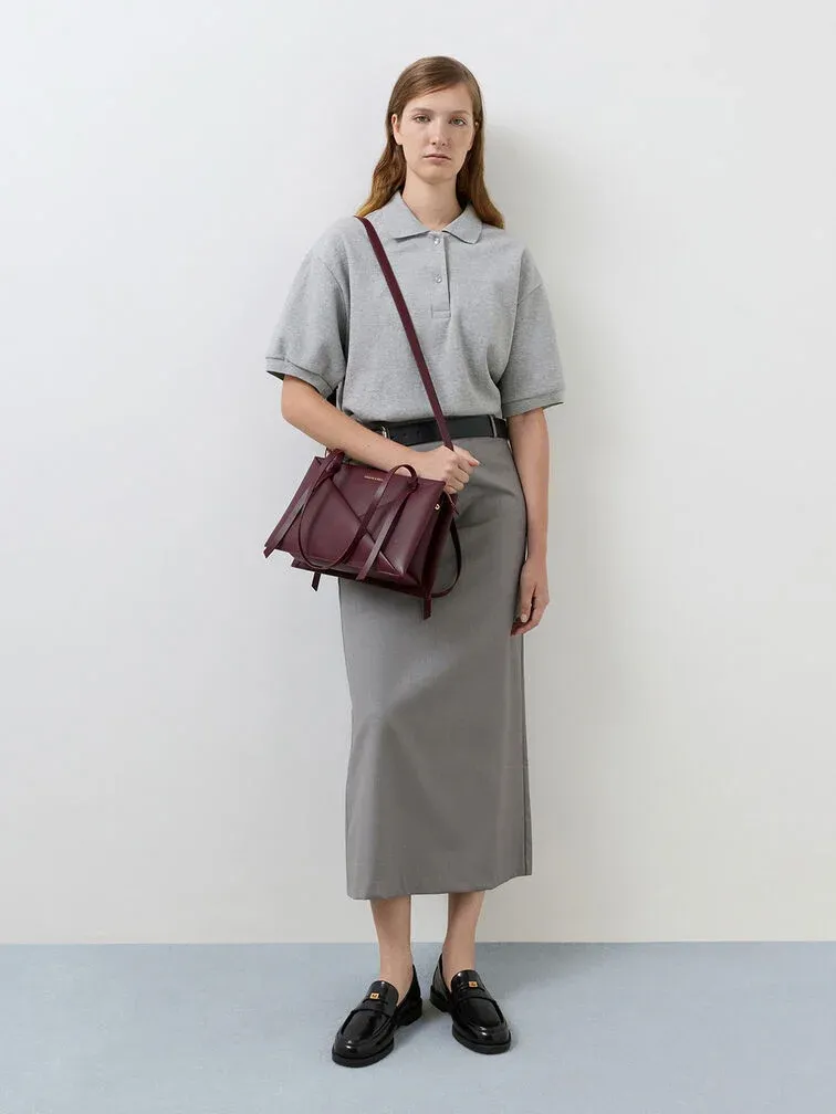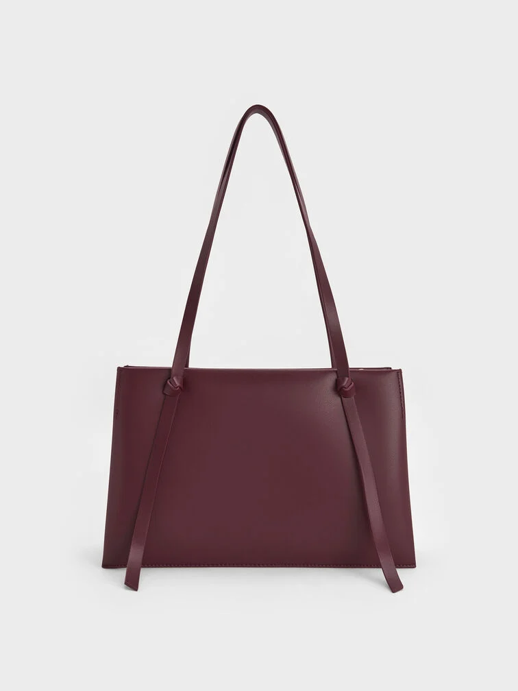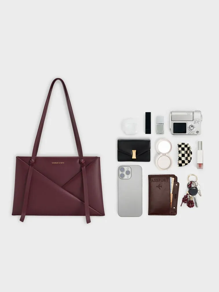 This Midori tote bag in wineberry red features a geometric panelled finish, double handles and a structured body. It will complement minimalist everyday ensembles with its clean lines and sleek details.
