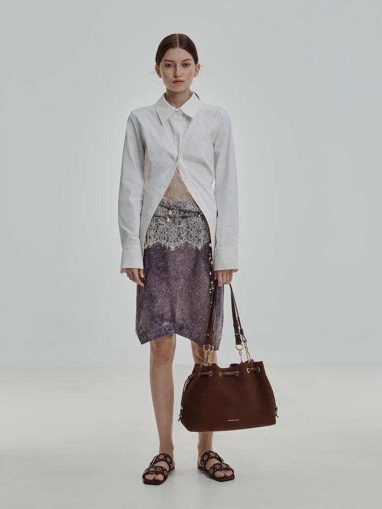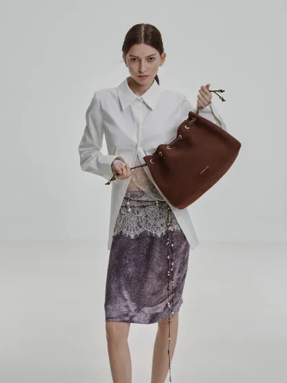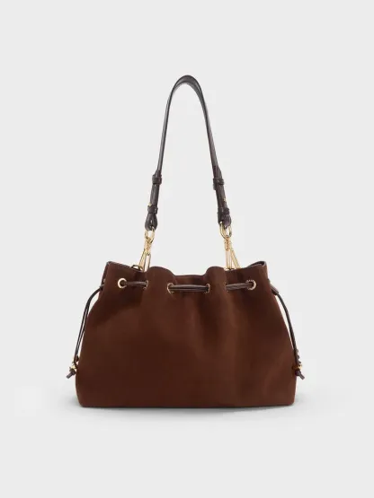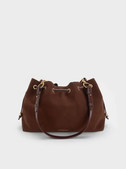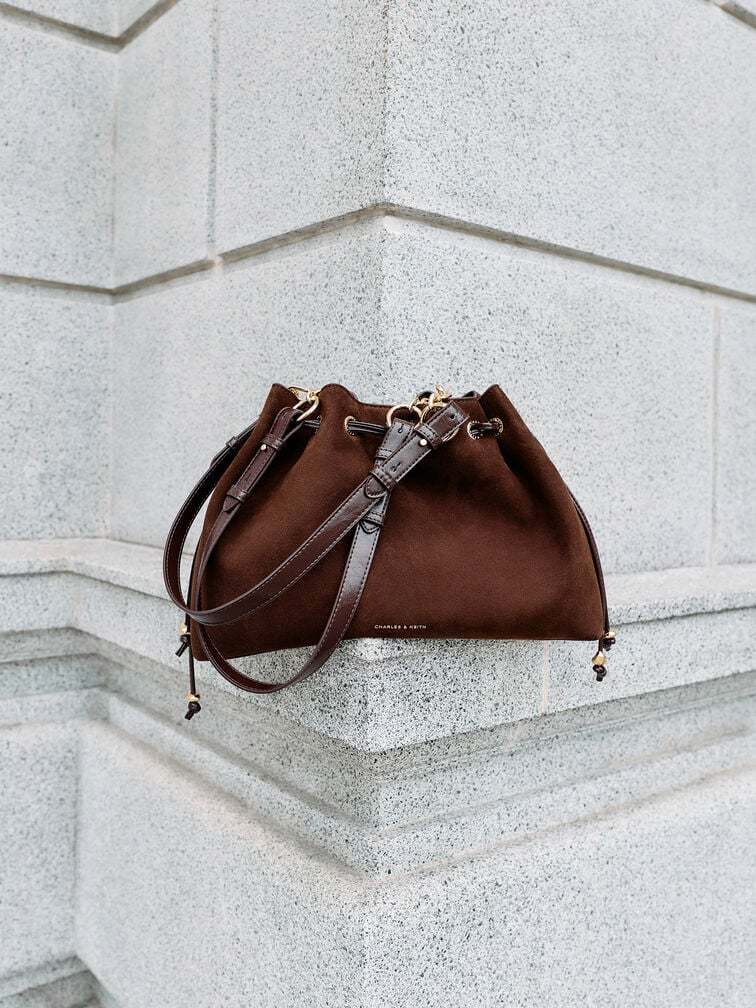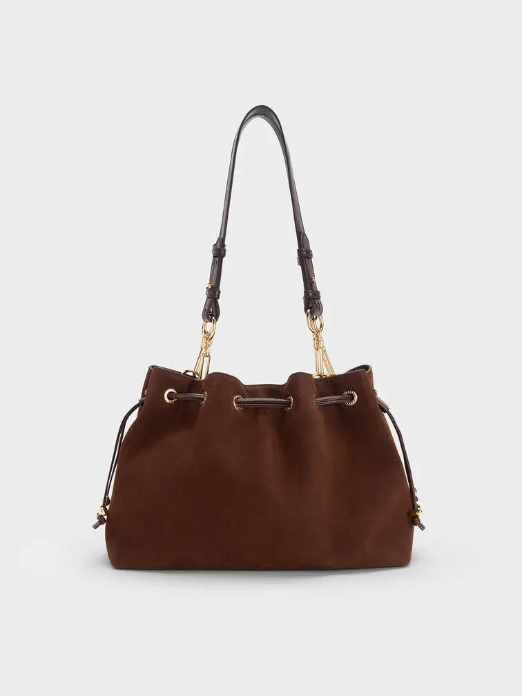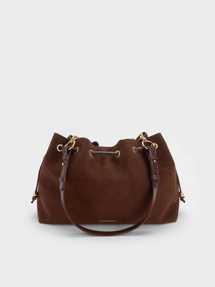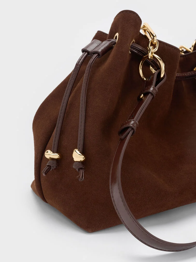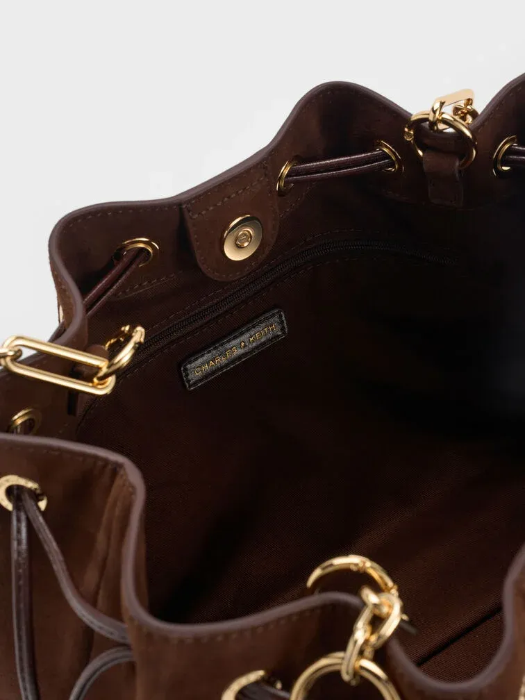 This Moxie bucket bag in dark brown features a drawstring closure, adjustable double handles, a detachable chain strap and striking metallic accents. With its roomy interior, it is perfect for busy on-the-go days when you need to carry a lot with you.