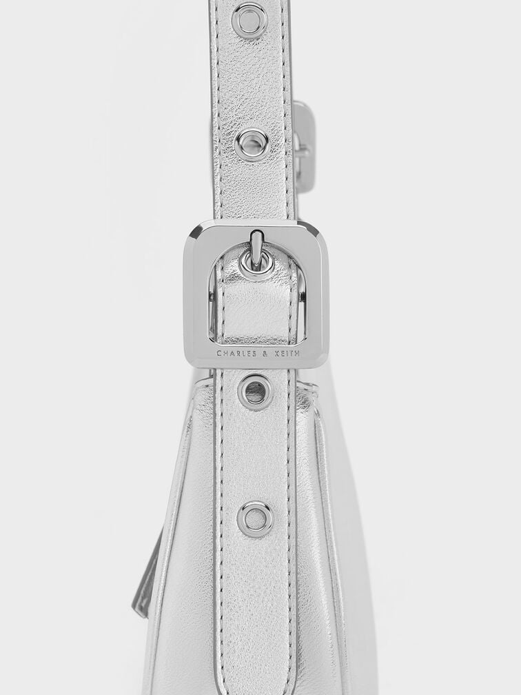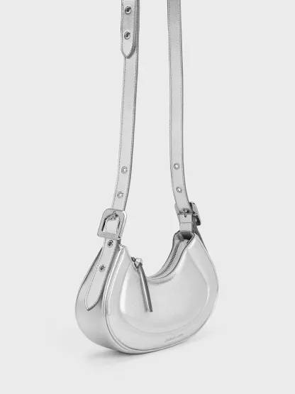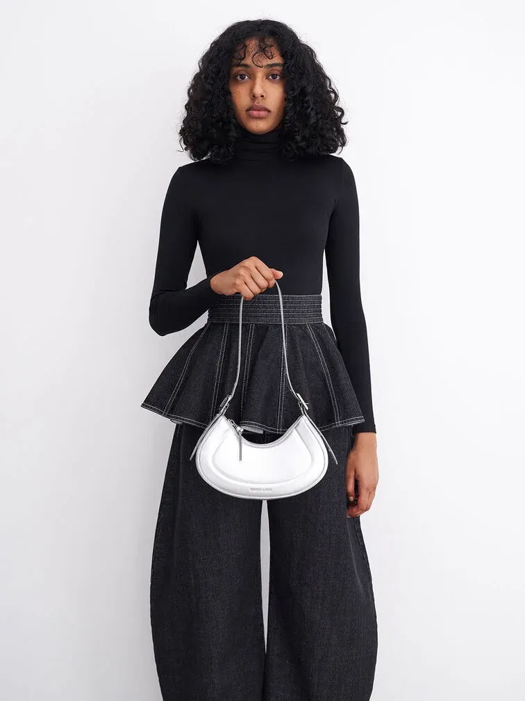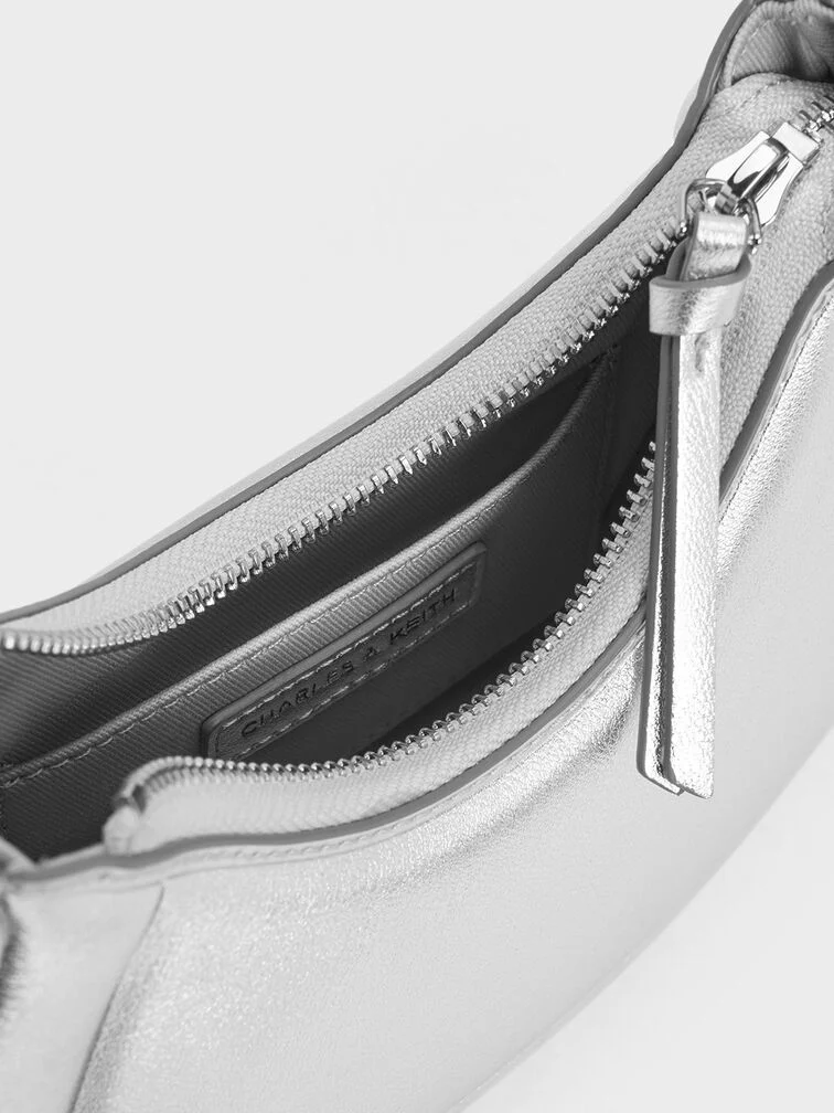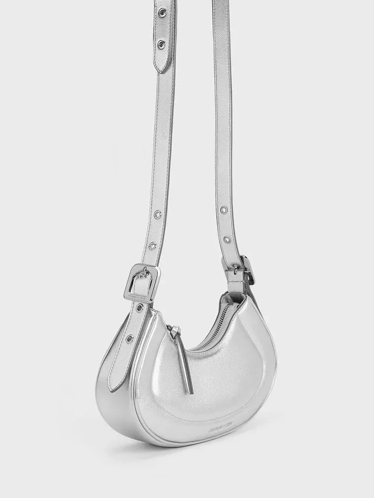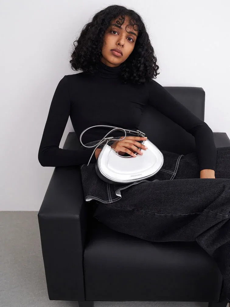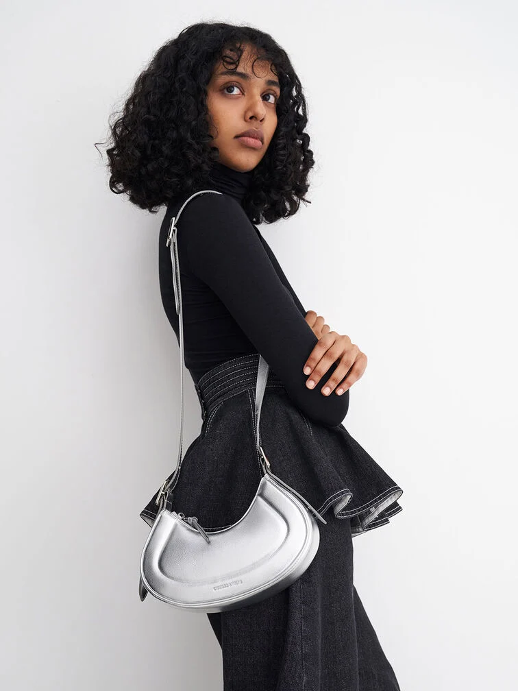 This Petra bag in shimmery silver is a fun statement piece to add to your collection. Featuring a sleek, Y2K-inspired curved silhouette and a thick adjustible shoulder strap, this bag will be a chic companion for any occasion. The main compartment offers ample space to hold your most-used items while the zip closure keeps them securely in place. Whether you wear it across your body, or tucked under your arm, this bag will deliver on the style front.