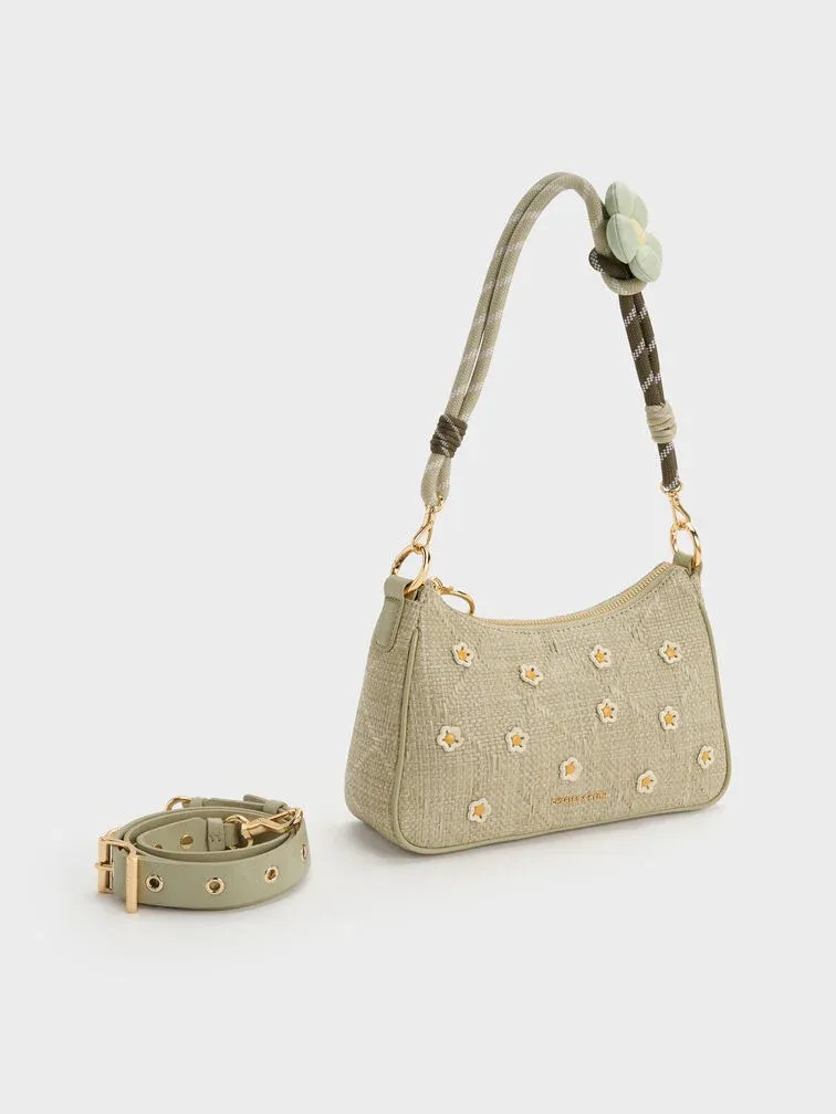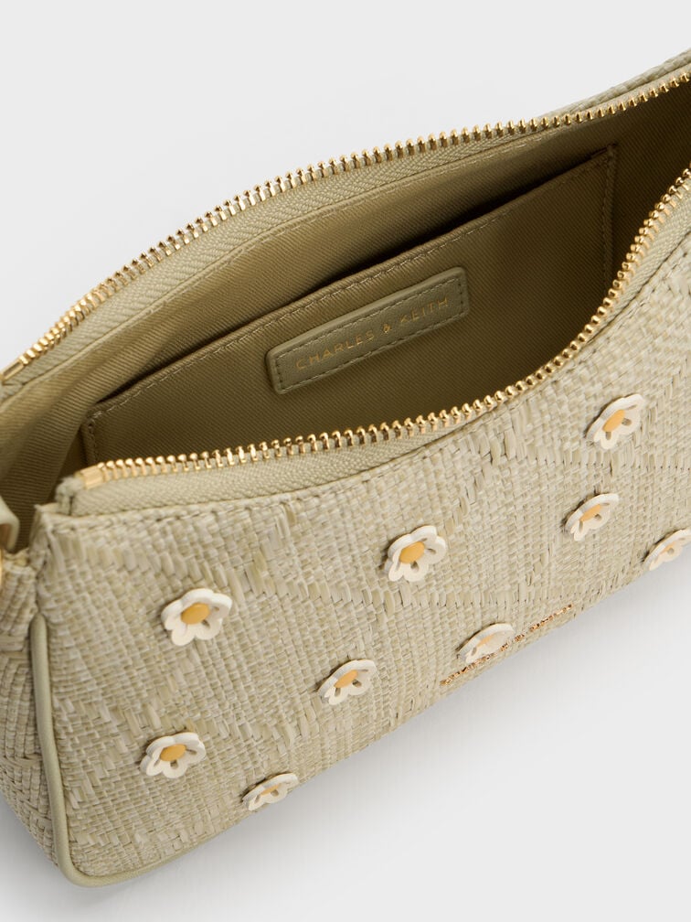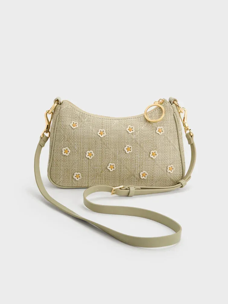 Philomena Raffia Flower Crossbody Bag - pale olive
